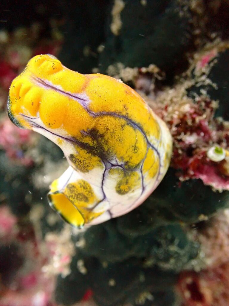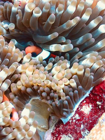 Für den zweiten Tauchgang ging es zunächst an ein flaches Riff. Später tauchten wir weiter ab und erreichten das Wrack eines Speedboots, das vor 20 Jahren absichtlich versenkt wurde. Um uns herum gab es Rochen, Clownfische, Skorpionfische und sogar kleine Blaupunkt-Mantas. Besonders spannend war auch die Begegnung mit ein paar Calamari. Nach 40 Minuten waren wir wieder an der Oberfläche.