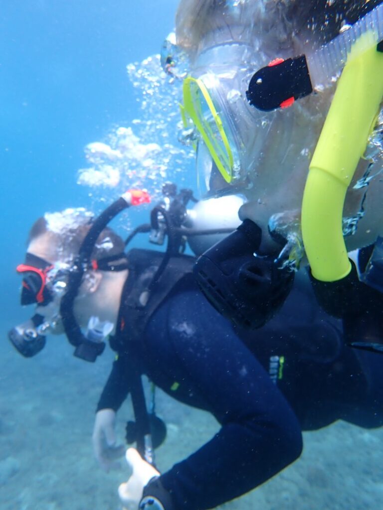 Wir waren auf Bali mehrfach in einer deutschsprachigen Tauchschule mit, Paradise Diving, unterwegs. Die Tauchschule liegt im Osten der Insel bei Jepun und war eigentlich nur rund 60 km von unserer Unterkunft entfernt, was bei balinesischem Verkehr mindestens 1,5 Stunden pro Weg bedeutet hat, was uns vorher nicht ganz klar war. Dort waren wir trotzdem an insgesamt 3 Tagen tauchen und können es wirklich empfehlen, die Guides waren sehr nett und wir haben uns rundum gut und sicher betreut gefühlt. Was allerdings etwas schade war, war dass die Tauchschule selbst keine Unterwasserkamera hatte.